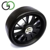 The ‘split-rim’ wheels are made from shock absorbing plastic. The wide pneumatic tyres are grass friendly.