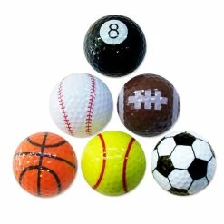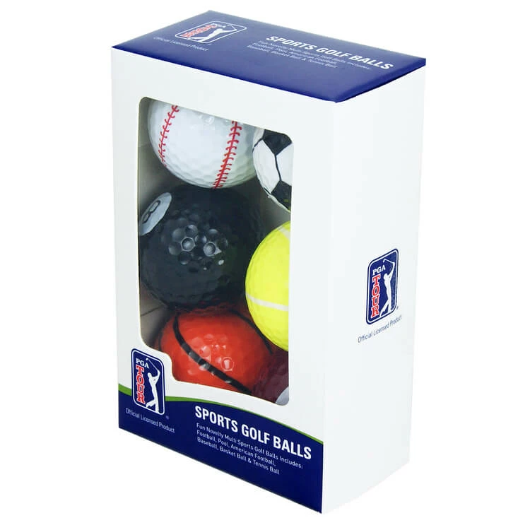 PGA Tour contains 6 balls with football, pool, American football, baseball, basketball, and tennis ball designs. Two-piece solid core construction. Novelty multi-sports golf balls.